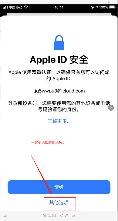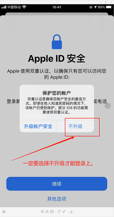 4. 如果提示AppleID安全问题 请点击底部-其他选项 -选择不升级,不要点升级账户!!!