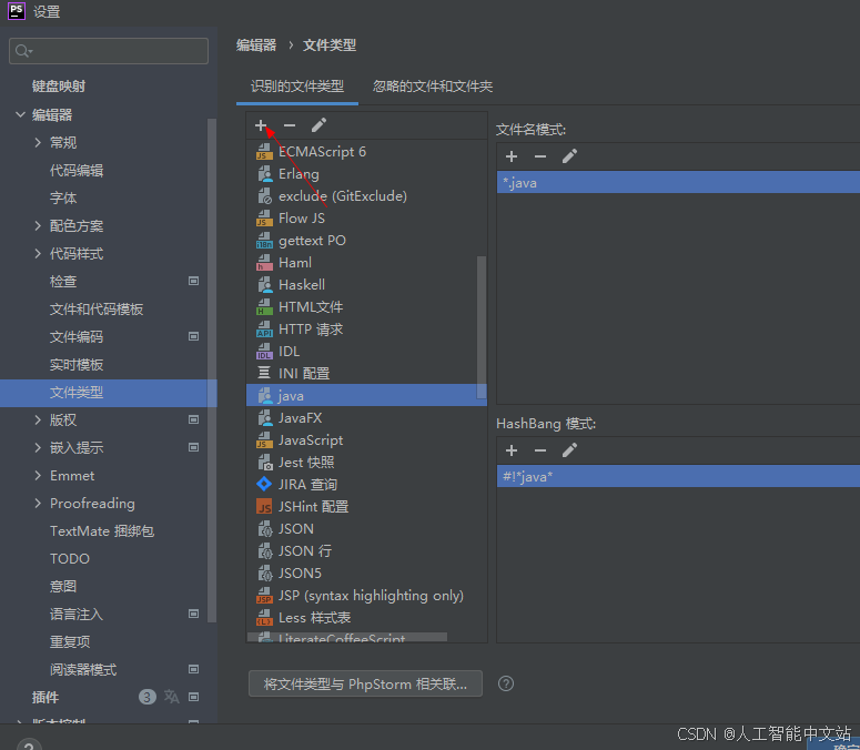 在 Recognized File Types 列表中,点击右上角的 + 按钮添加一个新的文件类型,命名为 Java。