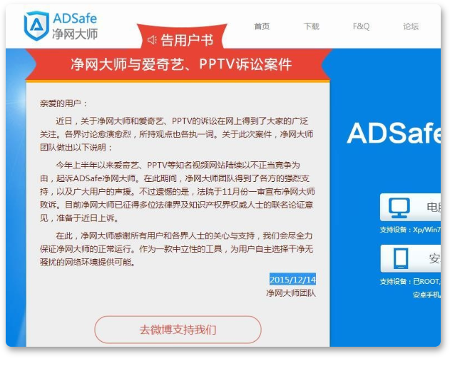 曾经网络上流行过一款非常知名的广告拦截软件——ADSafe,它集用户隐私保护、不良网站屏蔽、视频骚扰过滤等功能为一体,但是因为太过于招摇,最终在 2015 年被国内几家视频网站联名控告侵权,最终落了个败诉停更得结局,实在令人唏嘘。