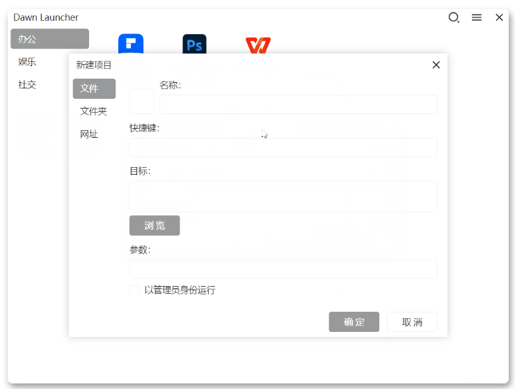 右键点击 Dawn Launcher 左侧栏位置,可以为自己创建一个分类,输入分类名称,名称根据个人喜好来,比如 「办公」、 「娱乐」这些都可以,还能为该分类配置快捷键,使用过程中,键入对应快捷键,可以快速打开分类。