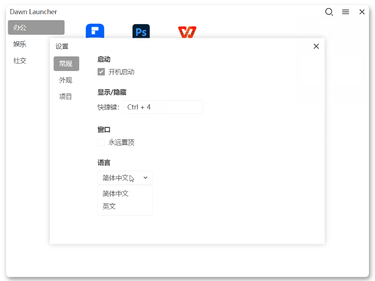 Dawn Launcher 还能设置开机自启以及通过快捷键快速显示和隐藏主界面,皮肤方面有黑白两色样式,分别对应白天和晚上的使用环境,还能调整布局样式以及图标大小。